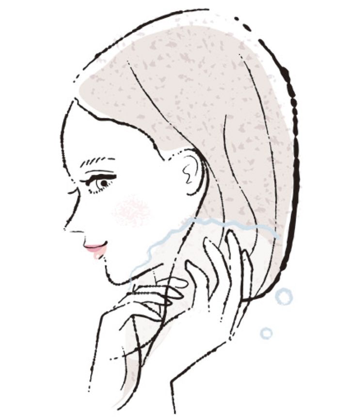 頭皮から流れてきたシャンプーの泡で髪を包み込み、髪を傷めないように手のひら全体でもむようにしながら、毛先までやさしく洗う