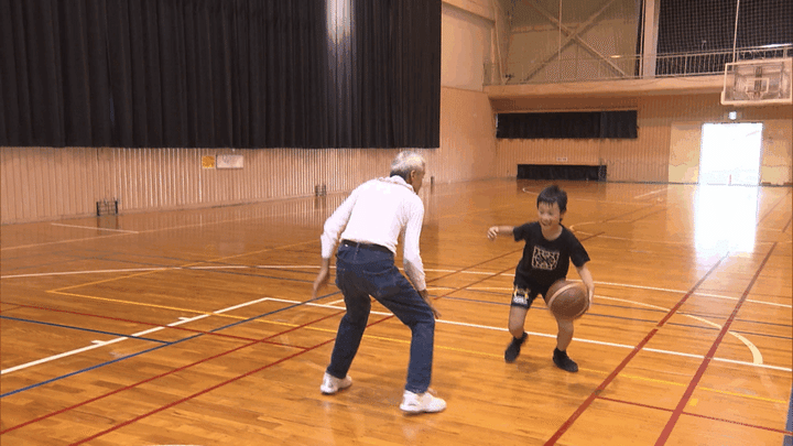 そのおじいちゃんは何故かGパン姿で、62年前からバスケをやっているそう。早速、1on1をやるのだが全てブロックされ、おじいちゃんも舌を出して“あっかんべぇ”と大人げない。が、「途中であきらめないことを教えたい」とも。そこで、特訓を開始。何と助っ人には、東京オリンピック銀メダリストの髙田真希