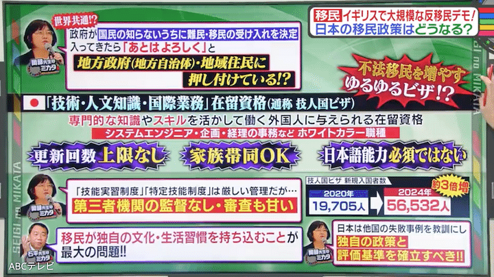 そもそも日本には、不法移民を増やす “ゆるゆるビザ” が存在する。専門的な知識やスキルを活かして働く「技術・人文知識・国際業務」在留資格(通称:技人国ビザ)は、「更新回数上限なし」「家族帯同OK」「日本語能力必須ではない」など、第三者機関の監督もなく、審査も甘い。