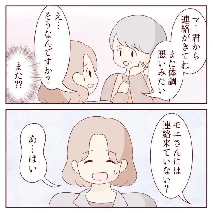 「マー君から連絡がきてね、また体調悪いみたい。」と心配そうに言う義母に「え、そうなんですか」と答えながら心の中では(また?)とうんざりしていました。「モエさんには連絡きていない?」って、知ってるでしょ、いつものことなんだから。