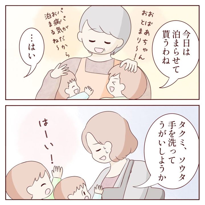 仕事を終えて4歳のタクミ、2歳のソウタを保育園に迎えに行った帰りにスーパーで買い物を済ませて帰宅するのが私のルーティン。夕方はバタバタです。帰宅すると、義母が「おかえりなさーい」と立っていました。「お、義母さん!?」