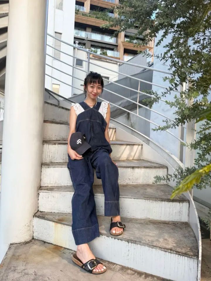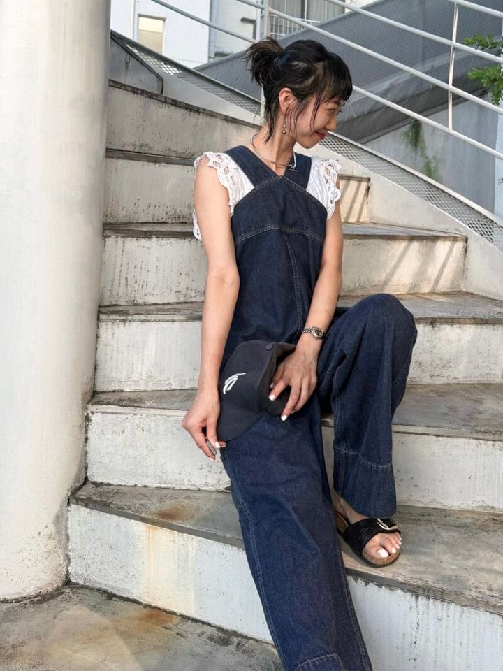 【30代スナップ】デニムサロペットが主役!レーストップス&キャップで甘辛MIXに