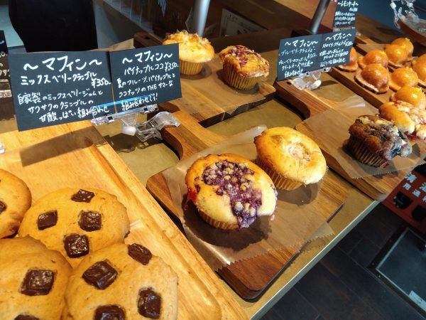 この日の焼き菓子は、ピーナッツチョコチャンククッキー、マフィン6~8種類、レモンケーキ、スコーン2種類、バナナブレッド、ヴィクトリアケーキ、カヌレでしたよ。マフィンに練り込まれたジャムは、季節のフルーツを炊き上げた自家製。パイナップル、ストロベリー、ミックスベリーなどたっぷりで、ボリューミーなマフィンですよ。