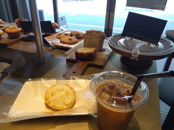 この日のスコーンは、プレーンとクランベリーの2種類。焼き上がり時間が10:20だったので、待ち時間にアイスコーヒーをカウンターでいただきましたよ。ミルクを入れてもらいましたが、あっさりしたほどよい苦みでオイシイ~。焼き菓子とベストマッチ!素朴な味わいのスコーンを焼きたてアツアツで食べられて、幸せ~。外ザクザク、中ふんわりでオイシイ~。