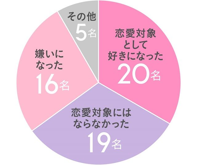 その結果、交際を続けるうちに「好きになった」という人は60名のうち20名。一方で、「恋愛対象にはならなかった」という人も同程度おり、関係の結末は人それぞれであることが見て取れます。