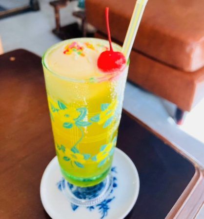 さくらんぼが乗っている緑色の飲み物は?と言われたらやはりこれ↑ですよね。そしてグラスがレトロでしょう?昭和生まれの人ならきっと家にこんなグラスがあったのでは⁈
