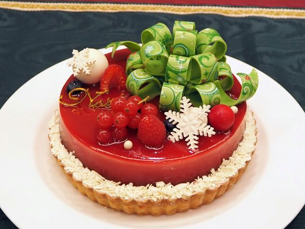 2位は、「あなたに贈るクリスマスケーキ」。カシスとラズベリーの鮮やかな色合いと、リボンに見立てたチョコレート細工が目を引きます。