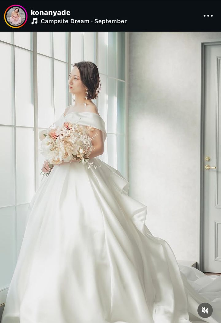 KONANは「ウェディングフォト撮ってきました〜」という報告とともに、オフショルダーの優雅なドレスをまとった写真を投稿しました。