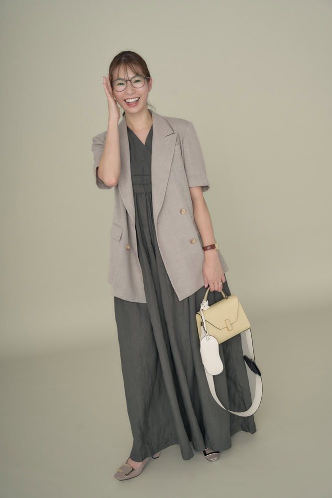 濃いめなフェイスなのでメガネをかけるとさらに印象が強くなるため、色やデザインを抑えたニュートラルカラーコーデにしました。秋のカーキ、ベージュ、ブラウンなどの枯色は、ともすると老け見えするので、かっちり感のあるジャケットを。歩くたび大きく揺れるフレアスカートワンピースで立体感を出し、イエローバッグでメリハリを出しました。