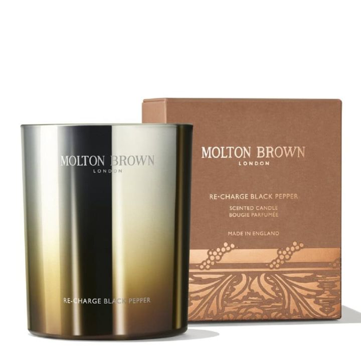 「ブラックペッパー」の特別なキャンドル。容器は、モルトンブラウン創業時のヘリテージにインスパイアされた、メイフェア・エボニーに煌びやかなアクセントを添えたデザインです。持続可能なミネラルワックスを使い、ボックスとキャンドルのグラスはリサイクル可能と、サステナブルも配慮されたアイテム。