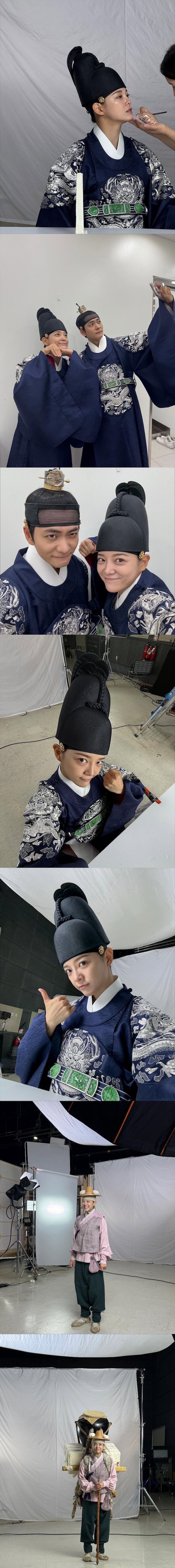 一方、王世子の象徴である紺色の袞龍袍(コンリョンポ)姿も。王世子イ・ガン役のカン・テオとの自撮り写真では、仲睦まじくお茶目な相性の良さをうかがわせた。