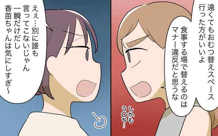 混んでいるレストランで、奈々の息子が店内で走り出さないか不安になる香苗。大きな声ではしゃぐものの、食事も無事に終わり香苗ほっとしてました。下の子のオムツ替えに行っていた奈々。トイレが混んでいたからと、食事の席でおむつ替えしだして、とうとう香苗と口論に…!
