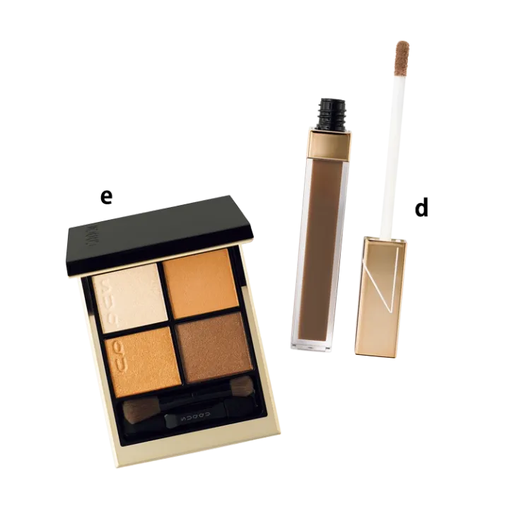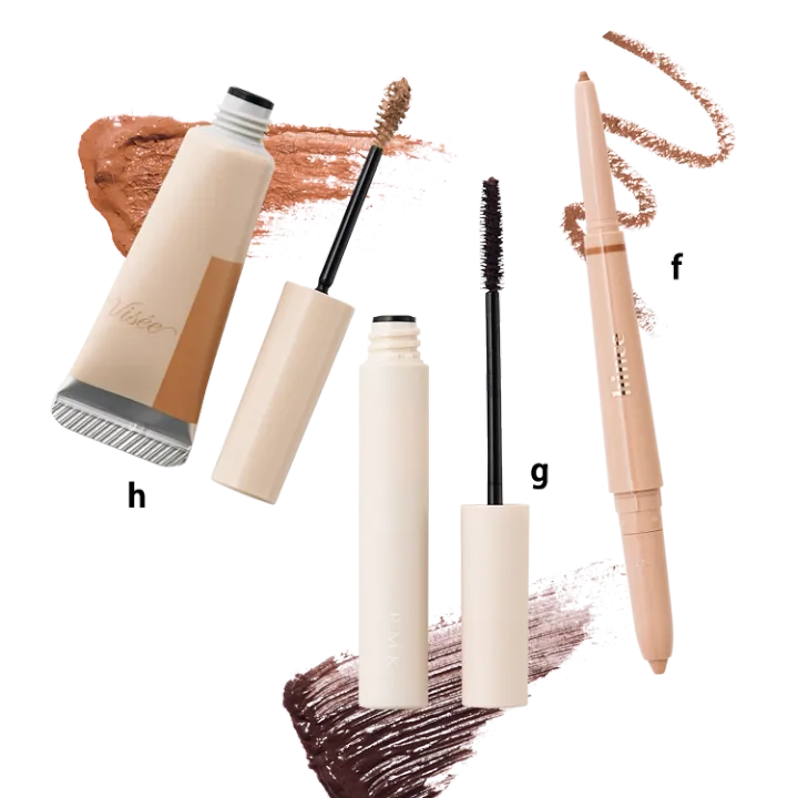 チークのbをほお骨に沿ってこめかみ方向へ広範囲につけたのち、cのハイライトを目頭と唇の山にオン。眉全体にh、唇にはdのグロスをつける。