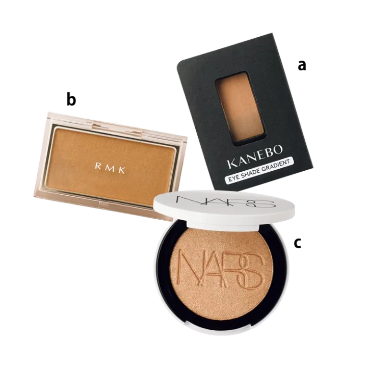 少しだけ黄みや赤みに傾いたベージュや透け感のある濃いブラウンなど、目元・チーク・リップの各パーツで色みや質感に変化をつけると、自然とメイクに抑揚が生まれて脱ブナンがかなう!