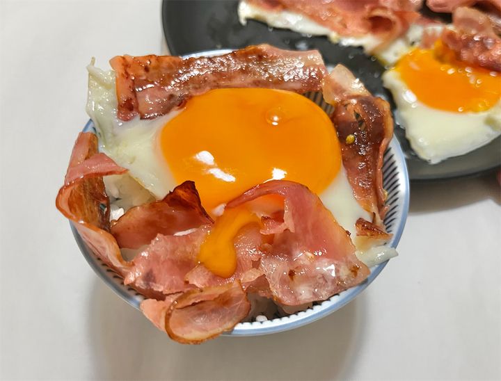 黄身のコクとベーコンの塩気、カリカリ食感が白ご飯と最高に合う!塩やしょうゆはかけていませんが、ベーコンの塩気だけでじゅうぶんです。まさに「和洋折衷ベーコンエッグ丼」に、朝からテンション爆上がりです!