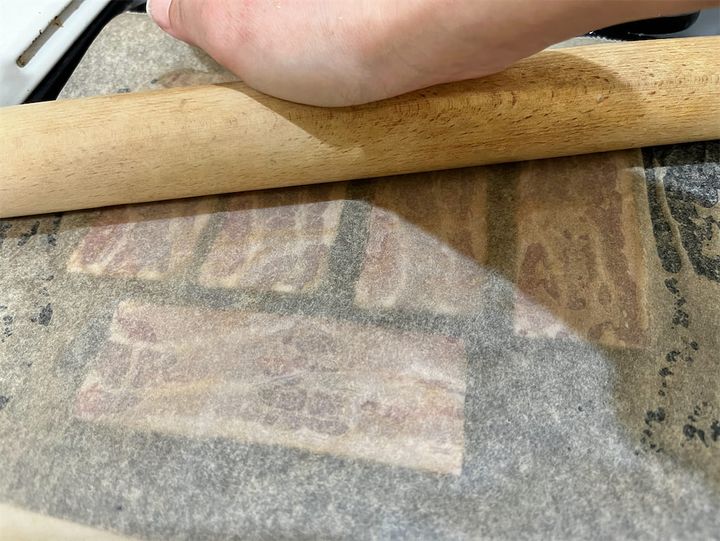 1. まな板にベーコンを並べ、その上にクッキングシートを重ねます。その上からめん棒でしっかり圧をかけながら転がし、ベーコンの繊維を潰すようにして薄くのばします。