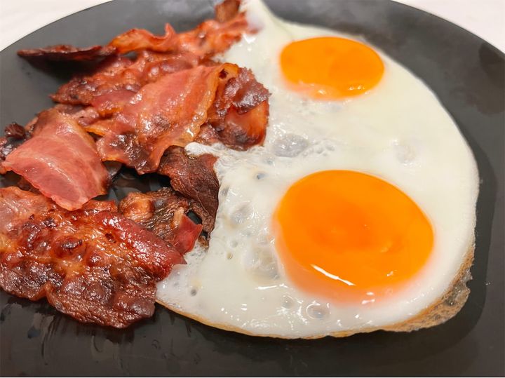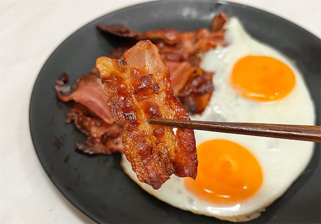 カリッと焼き色のついたベーコンと、ぷっくりした目玉焼きのコントラストがたまりません♡