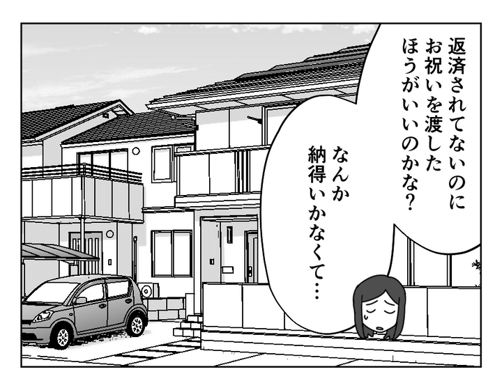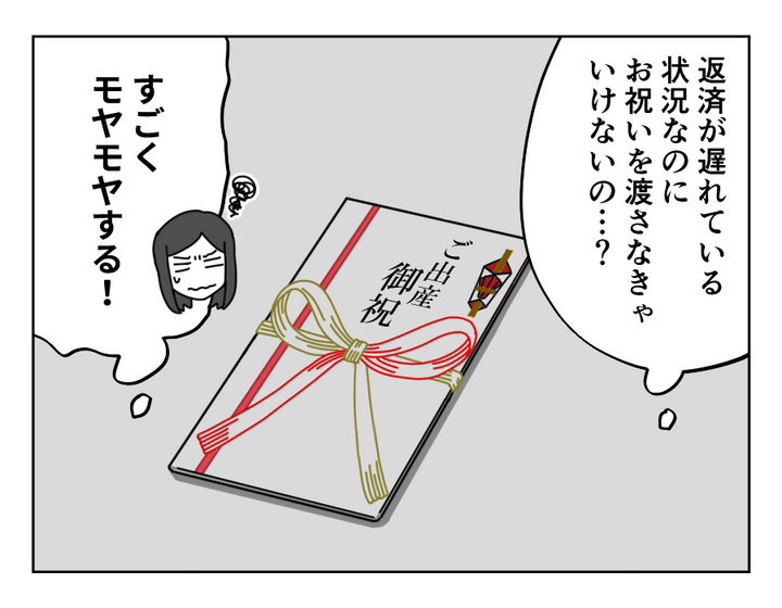 ミズキさんの兄・ケイシさんは事業で失敗して、ミズキさんの夫・リョウイチさんにお金を借りています。その金額なんと150万円。無利子かつ口約束という、信頼あってこその条件です。しかしここ最近、ケイシさんの結婚・奥さんの妊娠などがあったからか、返済が滞っています。そんなとき奥さんのエリナさんが出産。ミズキさんはこんな状態で出産祝いを渡すことにモヤモヤしています。