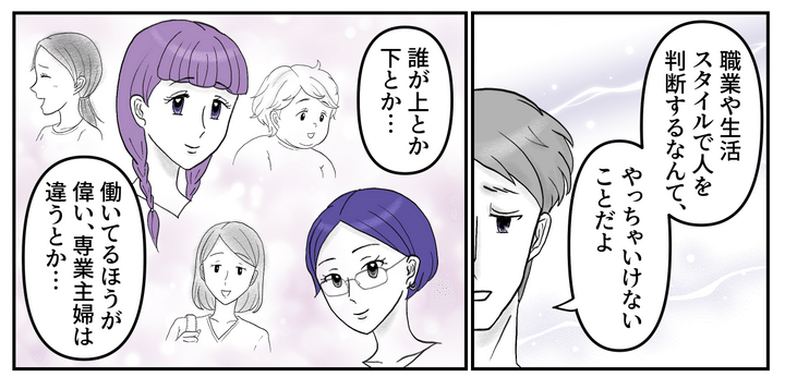 「ママ友から専業主婦扱いされた」と夫にグチると、「そもそも仕事のあるなしで差別すべきではない」と言われました。ユリカさんには別に悪意はなかっただろうし、ミナさんだってただバリバリ働くママたちに感心していただけじゃないか……と。