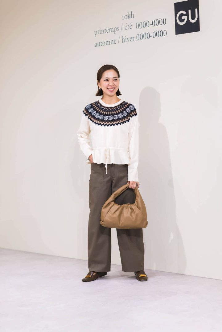 「サラッとした肌触りが魅力のノルディック柄ニットは、ほっこりしすぎず若見えさせてくれる一枚。ウエストにはドローストリングを配し、シルエットに変化をつけられるので、気分に合わせた着こなしが楽しめます。ボトムスは、今っぽいバレルパンツ。大きめポケットやハンマーループのワークなディテールが程よくカジュアルダウンしてくれ、子どもと一緒にテーマパークを歩き回る日も、テンション高めにおしゃれを満喫できるスタイルに。」