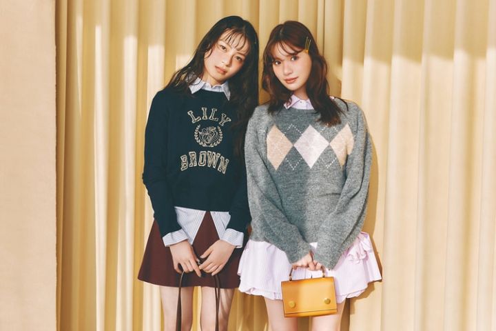 〈右・紅葉のコーデ〉アーガイル柄ニットトップス 9,990円/Gap シャツ 26,500円、スカート 17,600円/ともにThe Girls Society バッグ 89,100円/RSVP paris(クイーポ)ヘアピン(3個セット)9,900円/ザ ヘア バー トウキョウ〈左・理奈のコーデ〉ロゴニットトップス 13,970円/LILY BROWN シャツ 14,300円/Mardi Mercredi(MARDI MERCREDI JAPAN) ミニスカート 7,990円(オンライン限定)/Gap リボンクリップ(2個セット)1,650円/アネモネ(サンポークリエイト) バッグ 21,560/CHRISTINE PROJECT(HANA KOREA)