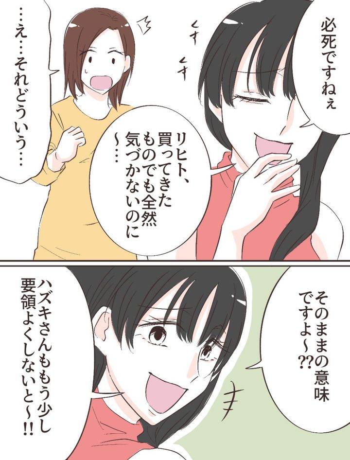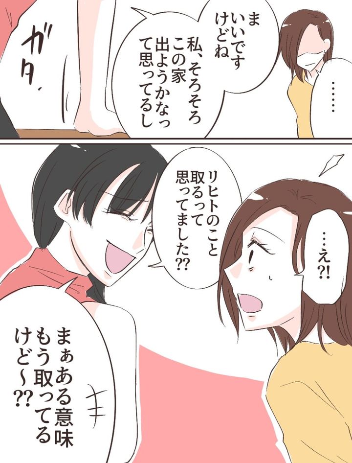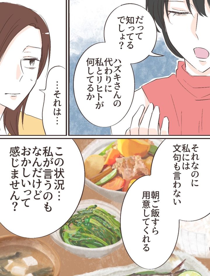 自分とリヒトさんの間に割り込んでくるユウコさんに早く出て言って欲しくて無理をして家事などを頑張っていたハズキさん。しかし、リヒトさんが女性をただの道具としか思ってないと気付いたユウコさんはそろそろハズキさん達の家から出ていこうと思っていました。リヒトさんを批判するユウコさんの言葉を聞いたハズキさんは「私のためにしてくれている」とリヒトさんを庇います。