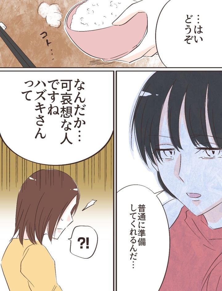 言われた通りに朝食を準備して「・・はい、どうぞ」と差し出した私に、ユウコさんは「普通に準備してくれるんだ・・」とボソッと言うと「なんだか・・可哀想な人ですね。ハズキさんって」と憐れむように言いました。