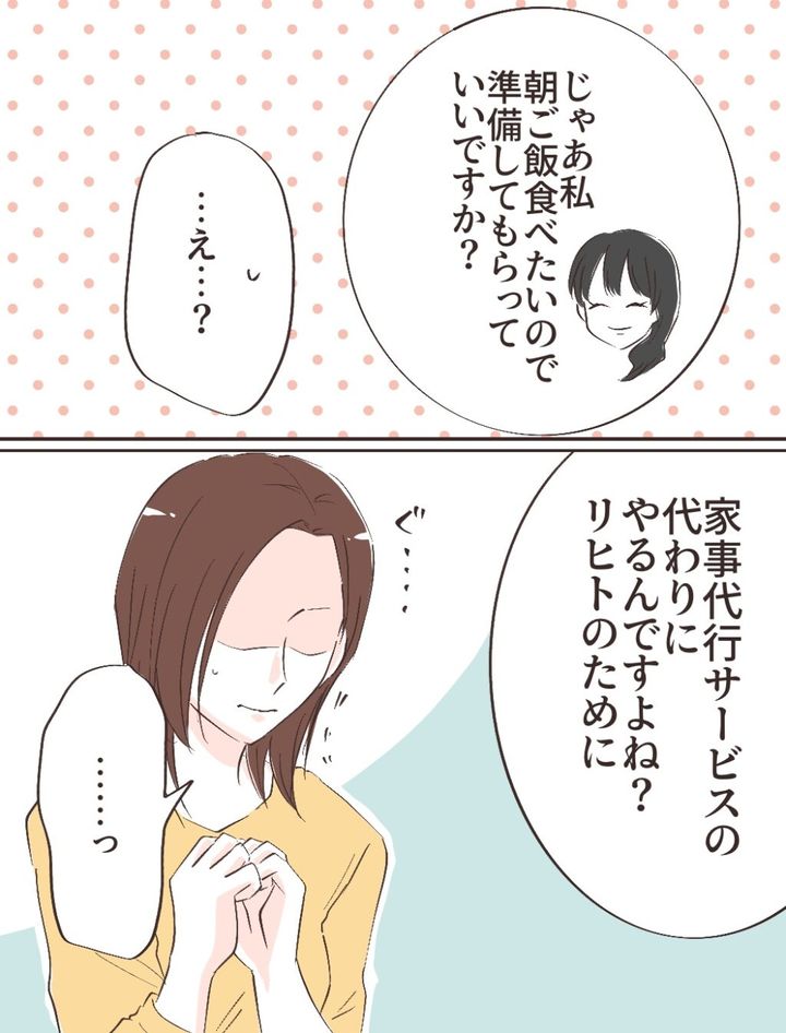 自分の手抜きをあっさり打ち明けたユウコさんは、悪びれることなく「じゃあ私、朝ごはん食べたいので準備してもらっていいですか?」とにっこり。「・・え・・?」と戸惑う私にユウコさんは「家事代行サービスの代わりにやるんですよね?リヒトのために」と詰め寄り、私は何も言い返せませんでした。
