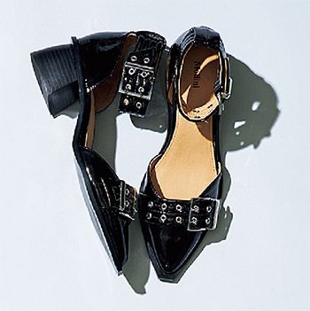 シャープに削がれたポインテッドトゥに、存在感のあるダブルベルトを配した攻撃的なデザイン。エナメルの艶やかさがフェミニンさを保ちつつ、バックルのメタルパーツがハードな印象をプラス。せり出したプラットフォームソールが、足元に重厚感と個性を添える。