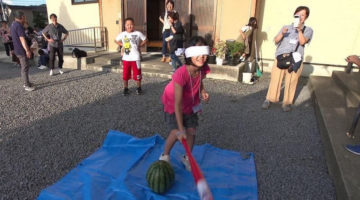 楽しそうにすいか割りをして、笑顔で楽しむ碓井さん親子。