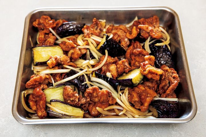 2. フライパンに揚げ油を深さ2cmほど注いで170℃に熱し、なすを入れ、ときどき返しながら2 分30 秒ほど揚げて油を切る。続いて豚肉を入れ、ときどき返しながら3 分、強火にして1 分ほど揚げ、油をきる。