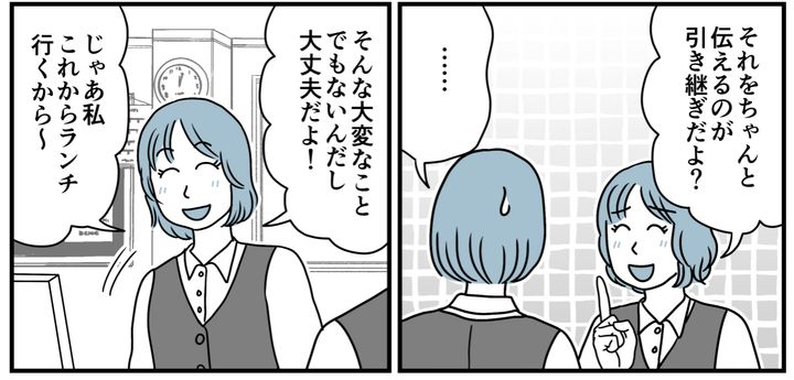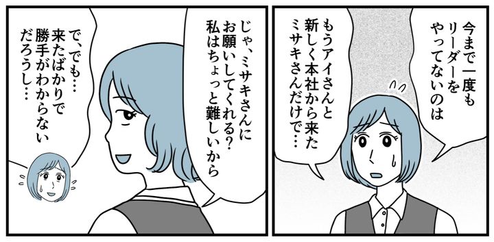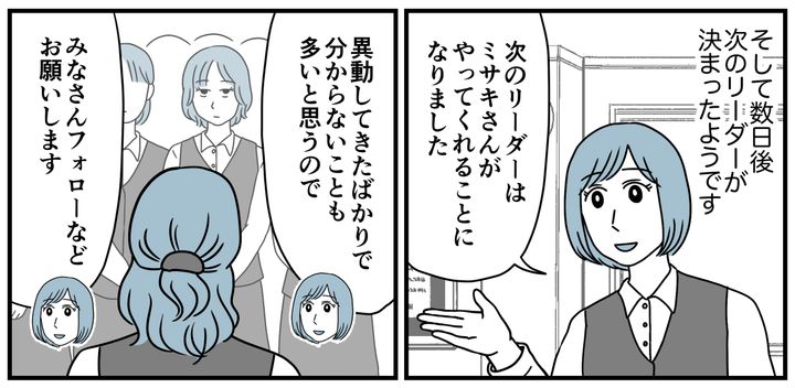 次のリーダーはミサキさんに決まりました。きっと頼み込まれて押し付けられたんでしょう。別の県から異動してきたばかりでこの辺りの事情が分からないはずだし、苦労するのは目に見えています。ミサキさんも内心では面倒だなと思っているかもしれません。でもハッキリ拒否しない方が悪いんです。