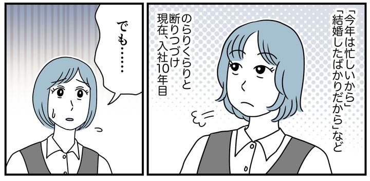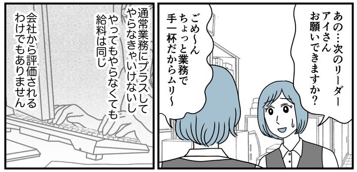 入社して何年か経つと、私にも「次のリーダーはアイさんにお願いしたいんですけど……」と声がかかるようになりました。けれどただ仕事が増えるだけだし、やるメリットは感じません。理由をつけてのらりくらりと断りつづけてきました。