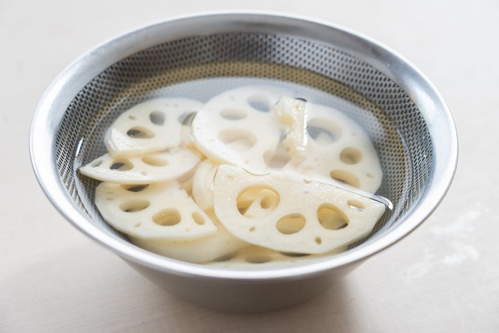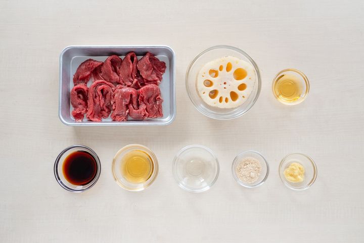 1. れんこんは皮をむき、5mm幅の半月切りにする。水に5分さらしてアクを抜き、水けをふく。牛肉は塩とこしょうを振り、片栗粉を揉み込む。