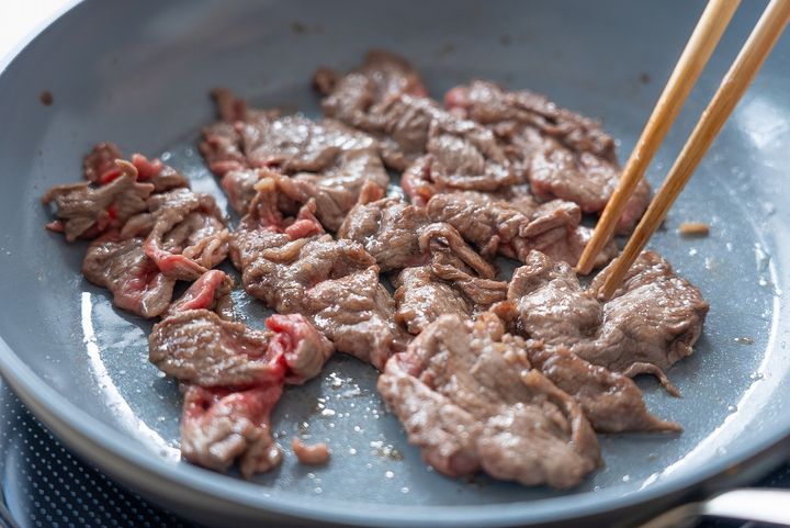 2. フライパンにごま油を中火で熱し、牛肉を入れて色が変わるまで炒め、一度取り出す。