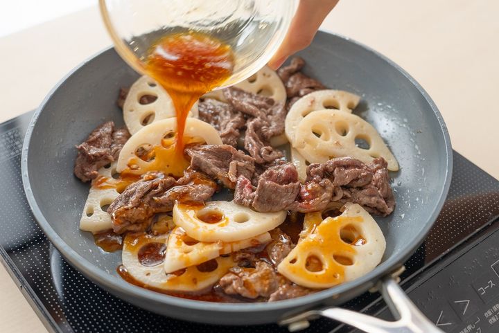 3. れんこんを入れ、中火で火が通るまで炒める。牛肉を戻して炒め合わせる。