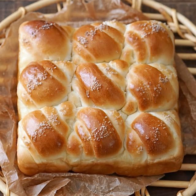 底面はカリカリ、中はふわふわの塩パンも自宅のオーブンで作れます。9つに分けた生地を型に入れて焼くことで、ボリューミーかつ食べやすい塩バターちぎりパンが完成!