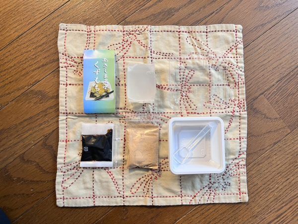 容器の中にはくず餅そのものの他、きなこと黒蜜、スプーンも入っていました。