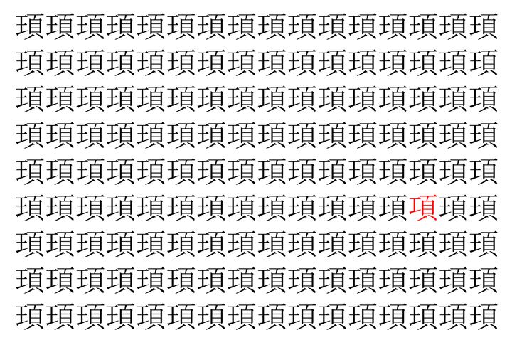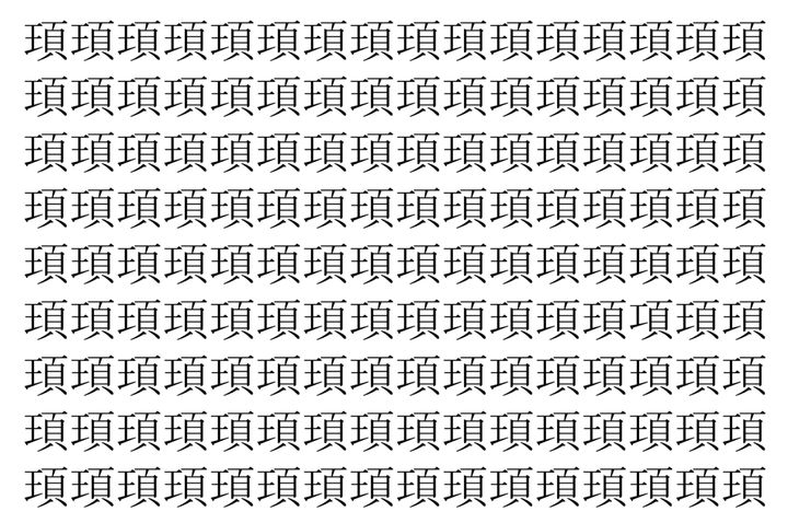 画像の中には、「頊」という漢字が縦に9行、横に16個並んでいます。 全部で144個となりますが・・・、そのうち1つは「異なる漢字」となってますよ!!