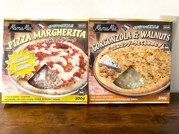 業務スーパーには冷凍コーナーにピザやピザ生地などがいくつか売られていますが、筆者が行くたびに購入するのはイタリアから直輸入しているこちらの商品です。「ピザマルゲリータ」(429円)と「ゴルゴンゾーラとくるみ」(645円)。