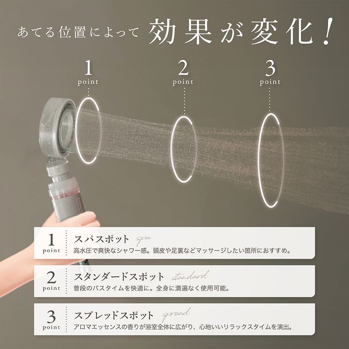 別売りのシャワーヘッドはトルネードのように水が出てくるので位置を変えるだけで様々な効果が。高水圧で爽快なシャワー感、頭皮や足裏などマッサージしたい箇所におすすめな「スパスポット」、普段のバスタイムを快適に、全身に満遍なく使用可能な「スタンダードスポット」、そしてアロマエッセンスの香りが浴室全体に広がり、心地いいリラックスタイムを演出する「スプレッドスポット」の3種のシャワーモード。毎日のシャワーの中でもケアしたいところのあてる位置を変えるだけで、直感的に調整できるストレスフリーな設計です。