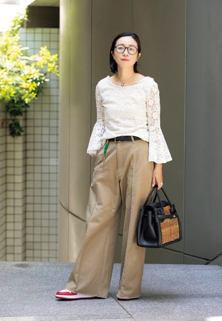 「ツイッギーが流行った1960年代のクラッシックな雰囲気のブラウスを、チノパンとエアジョーダンで、今の気分に合うよう自分らしくスタイリングしました。エバゴスのかごバッグで品のよさをプラスして全体のバランスも調整。よく褒めてもらえるブラウスは、15年ほど前に購入し大切に着ています」