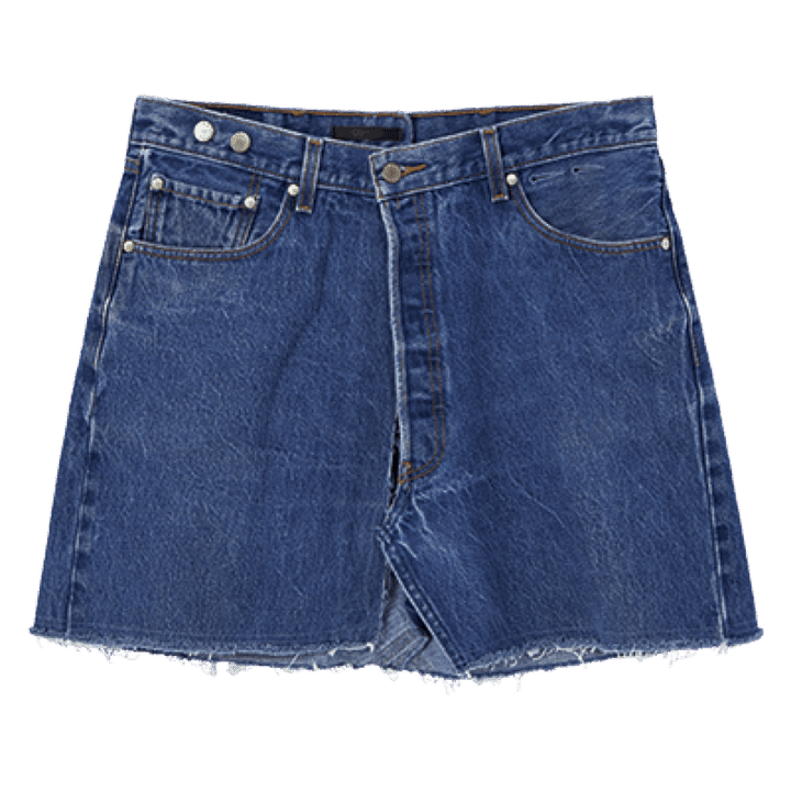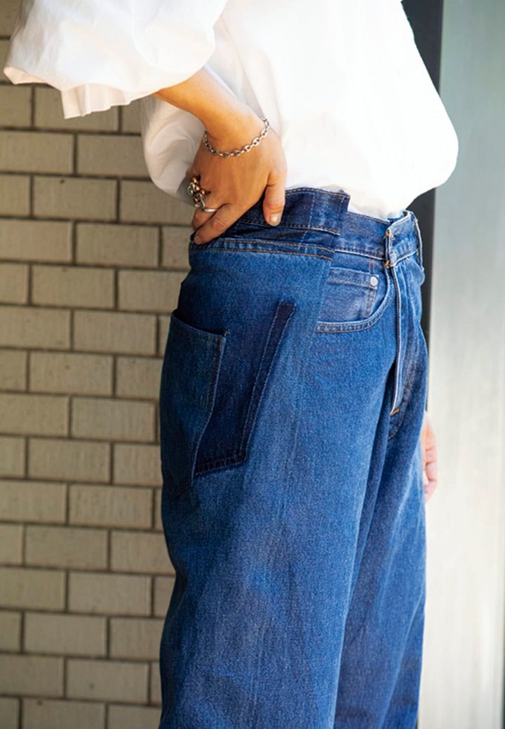 キイトのリメイクデニムは固定観念にとらわれない独特なカッティングが魅力。どんなアイテムとも相性がよく、スタイリングに困りません。フロントボタンはボタンホールを右にずらして着用。