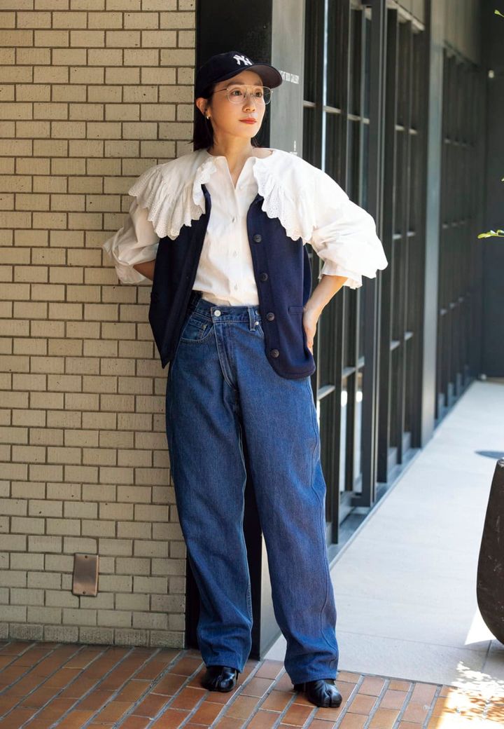「白いブラウスにデニムという鉄板のスタイリングですが、大ぶりのフリルカラーやリメイクデニム、キャップやリングの重ね着けで遊びをたっぷり取り入れてみました」