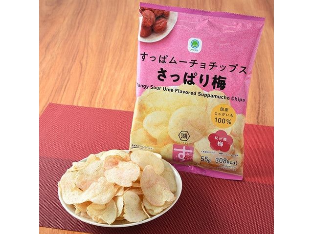 国産じゃがいも100%、紀州産梅を使用した、梅のほんのりやわらかな酸味、じゅわっとした甘みが特徴のポテトチップスです。
