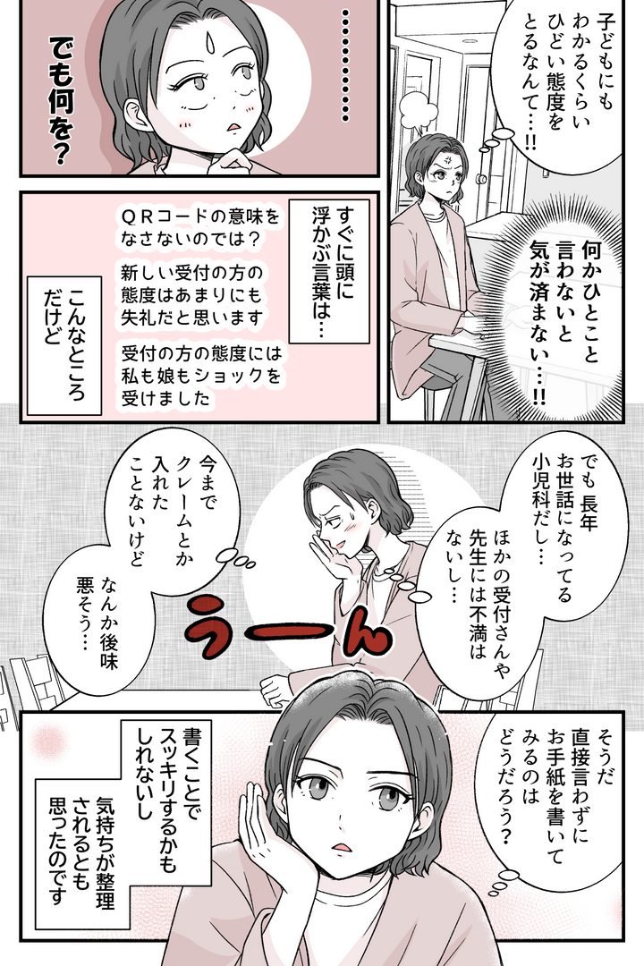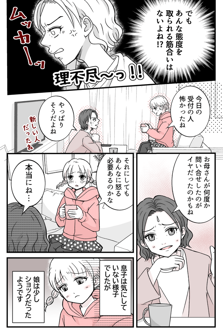 子どもにもわかるほどの受付の女性の不快な態度に、帰宅後も怒りが収まりませんでした。私自身も、予想外の場所で無礼な対応を受けて、ショックを受けたのだと思います。まるで突然怒鳴られたような気分でした。理不尽さへの動揺と驚きが、次第に怒りに変わったような感覚です。