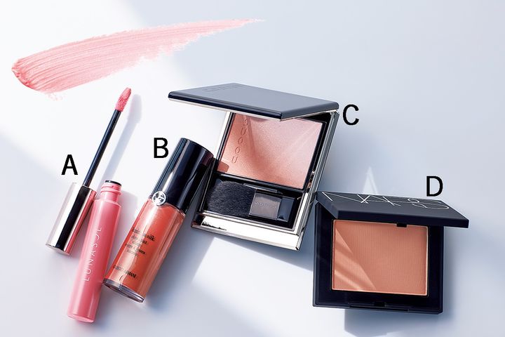 表情を明るく見せるピーチやアプリコット、コーラルのチークで夏の疲れを吹き飛ばし、幸福感あふれる表情に。