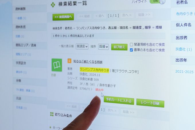 小林:うちの先生の本が貸出中! 大事そうに印刷した本の場所が書いてあるペーパーを持ってますけど?