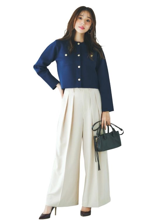 ニットジャケット¥9,493/NATURAL BEAUTY BASIC タックワイドパンツ¥13,200/ココディール ピアス¥28,380、バングル¥34,980/ともにソコ(ズットホリック) バッグ¥71,500/メアリオルターナ(AL Design Inc.) パンプス¥18,150/ダイアナ(ダイアナ銀座本店)