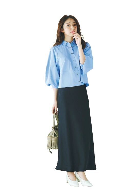 シャツ¥7,990/アンフィーロ(オンワード樫山) サテンスカート¥9,990、パンプス¥11,000/ともにPLST ネックレス¥2,750、バングル¥2,530/ともにアネモネ(サンポークリエイト) リング¥12,650/ココシュニック オンキッチュ(ココシュニック) バッグ¥6,490/カシュカシュ(アンビリオン)